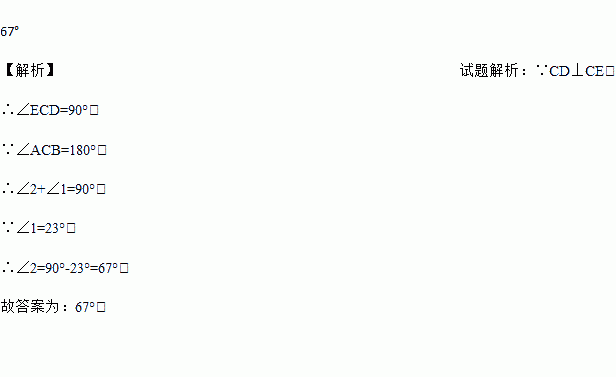 如图,A、B、C三点在一条直线上,若CD⊥CE,∠1=23°,则∠2的度数是_____.