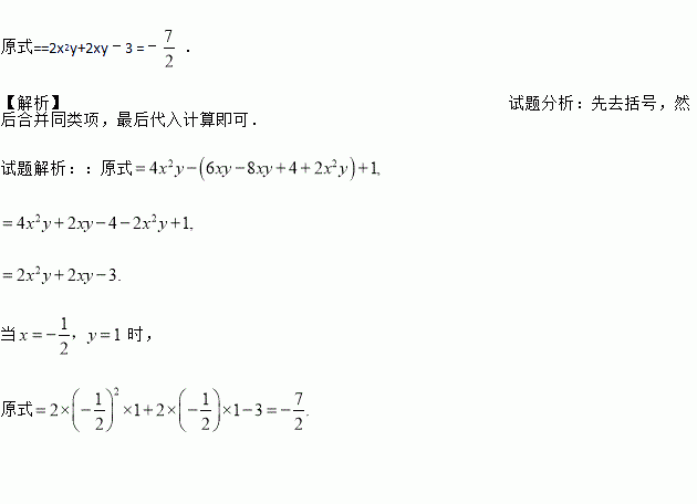先化简,再求值:4x2y﹣[6xy﹣2(4xy﹣2)+2x2y]+1,其中x=﹣,y=1.