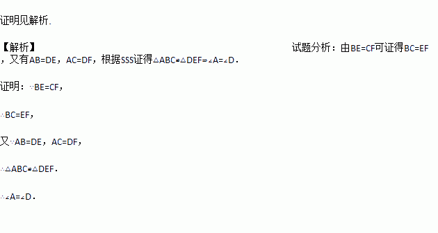 如图,点B、E、C、F在一条直线上,AB=DE,AC=DF,BE=CF。求证:∠A=∠D.
