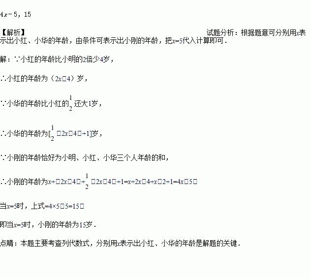 已知今年小明的年龄是岁,小红的年龄比小明的2倍少4岁,小华的年龄比小红的还大1岁,小刚的年龄恰好为小明、小红、小华三个人年龄的和.试用含的式子表示小刚的年龄,并计算当时小刚的年龄.