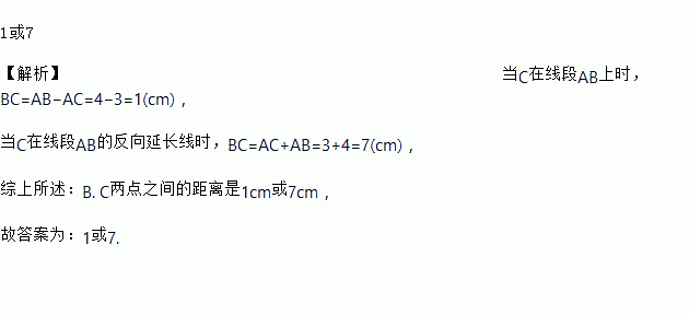 1或7 【解析】当C在线段AB上时,BC=AB?AC=4?3=1(cm), 当C在线段AB的反向延长线时,BC=AC+AB=3+4=7(cm), 综上所述:B. C两点之间的距离是1cm或7cm, 故答案为:1或7.