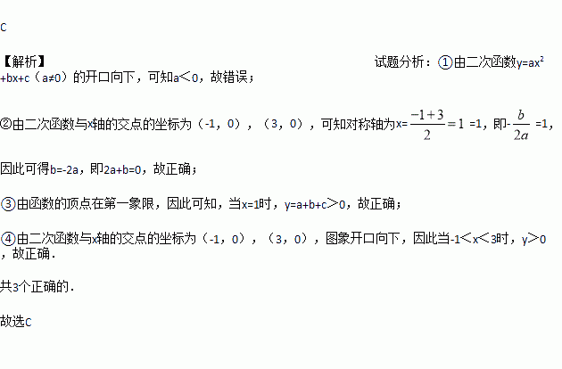 如图为二次函数y=ax2+bx+c(a≠0)的图象,则下列说法:①a>0 ②2a+b=0 ③a+b+c>0 ④当﹣1<x<3时,y>0,其中正确的个数为( )