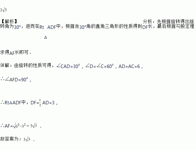 如图,将边长为6的等边三角形ABC绕点A逆时针旋转30度后得到△AED,边AC与DE交于点F,则AF的长为__.
