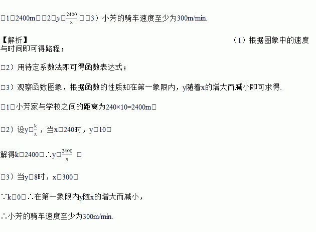 小芳从家骑自行车去学校,所需时间y(min)与骑车速度x(m/min)之间的反比例函数关系如图.
