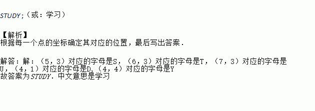 有一个英文单词的字母顺序对应如图中的有序数对分别为(5,3),(6,3),(7,3)(4,1),(4,4),请你把这个英文单词写出来或者翻译成中文为 。