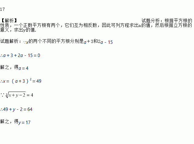 已知x的两个不同的平方根分别是a+3和2a-15,且 ,求x,y的值.