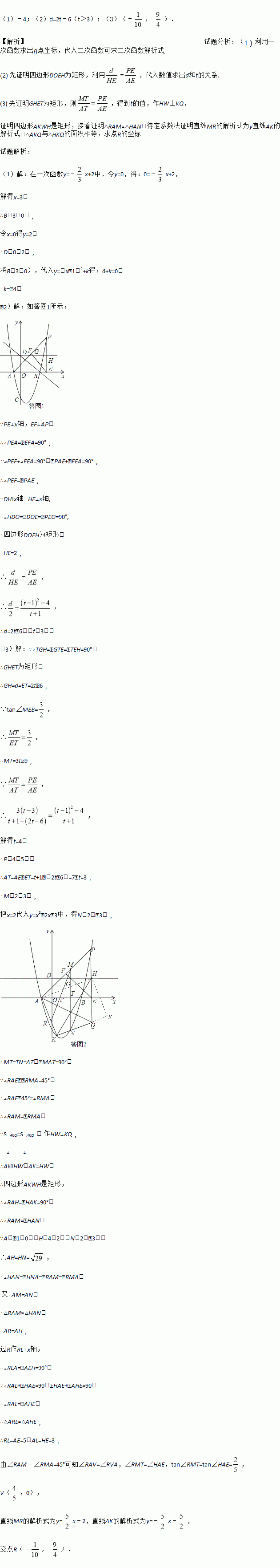 (2)如图2,在第一象限的抛物线上有一动点P,连接AP,过P作PE⊥x轴于点E,过E作EF⊥AP于点F,过点D作平行于x轴的直线分别与直线FE、PE交于点G、H,设点P的横坐标为t,线段GH的长为d,求d与t的函数关系式,并直接写出t的取值范围;