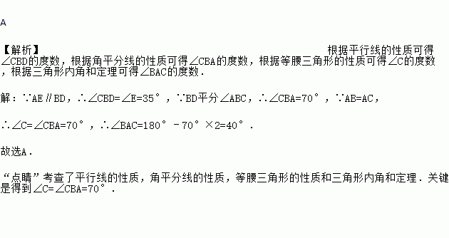 如图,在△ABC中,AB=AC,BD平分∠ABC交AC于点D,AE∥BD交CB的延长线于点E.若∠E=35°,则∠BAC的度数为( )