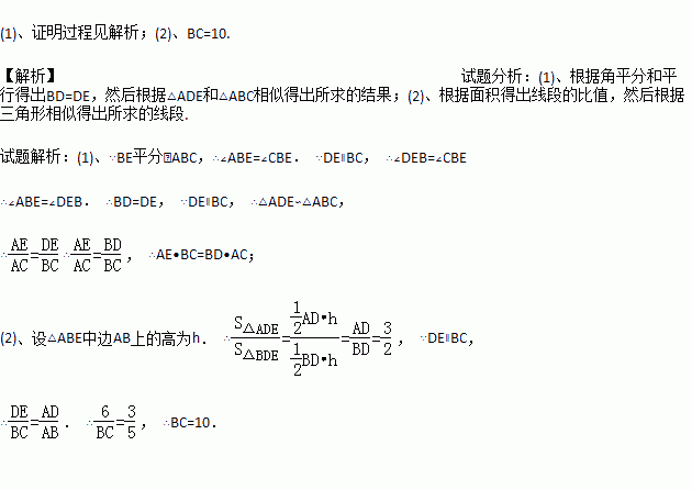 (2)如果S△ADE=3,S△BDE=2,DE=6,求BC的长.