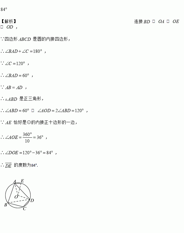 如图,在⊙的内接四边形中, , ,点在弧上.若恰好为⊙的内接正十边形的一边,弧的度数为__________.