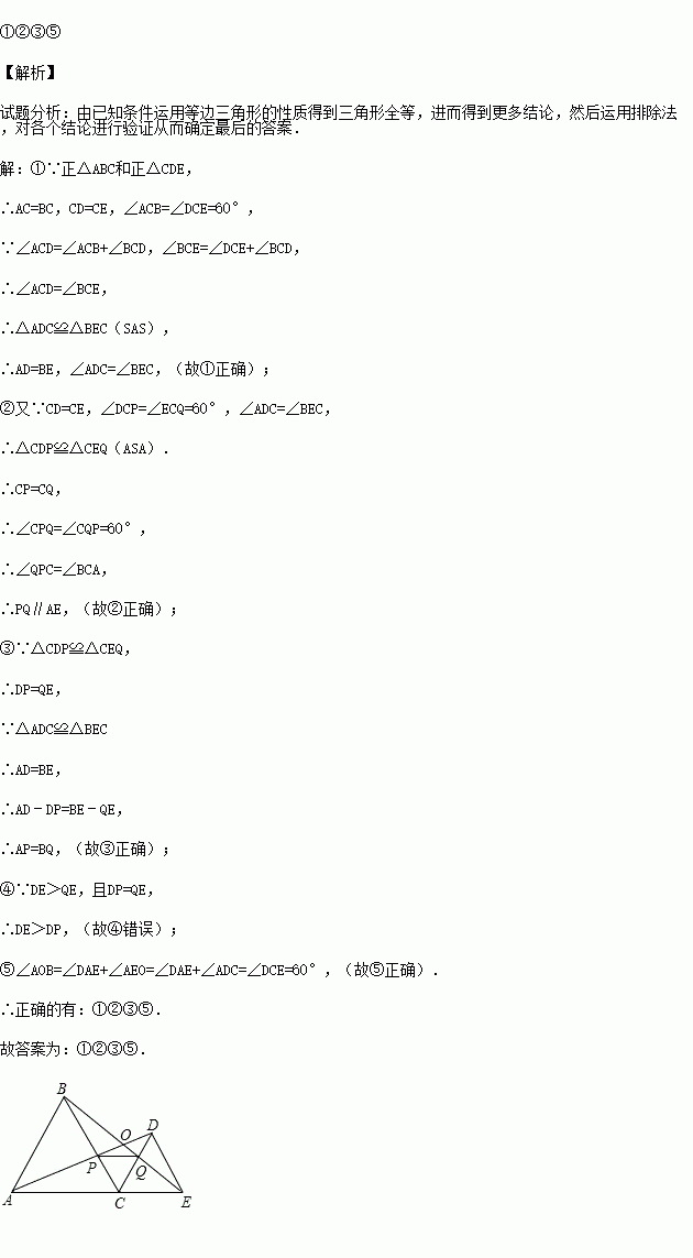如图,C为线段AE上一动点(不与点A、E重合),在AE同侧分别作正△ABC和正△CDE,AD与BE交于点O,AD与BC交于点P,BE与CD交于点Q,连接PQ.以下五个结论:①AD=BE;②PQ∥AE;③AP=BQ;④DE=DP;⑤∠AOB=60°.