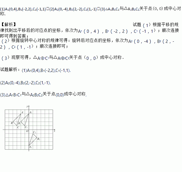 (3)¹Û²ì¡÷A1B1C1ºÍ¡÷A2B2C2,ËüÃÇÊÇ·ñ¹ØÓÚijµã³ÉÖÐÐĶԳÆ?ÈôÊÇ,Çëд³ö¶Ô³ÆÖÐÐĵÄ×ø±ê;Èô²»ÊÇ,˵Ã÷ÀíÓÉ.