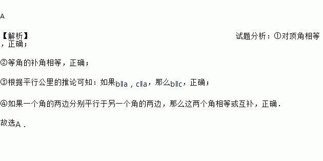 A 【解析】试题分析:①对顶角相等,正确; ②等角的补角相等,正确; ③根据平行公里的推论可知:如果b∥a,c∥a,那么b∥c,正确; ④如果一个角的两边分别平行于另一个角的两边,那么这两个角相等或互补,正确. 故选A.