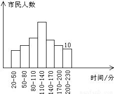 随着宜昌市精神文明建设的不断推进,市民八小时以外的时间越来越多,下面是某报记者在抽样调查了一些市民八小时以外用于读书的时间单位:分钟后,绘制的频数分布直方图,从左至右的前六个长方形所相对应的频率之和为,最后一组的频数是10,则此次抽样调查的人数共有