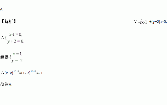 A 【解析】∵+(y+2)2=0, ∴ 解得 ∴(x+y)2015=(1- 2)2015=- 1. 故选A.