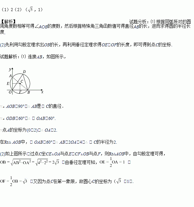 如图,⊙C经过原点且与两坐标轴分别交于点A和点B,点A的坐标为(0,2),D为⊙C在第一象限内的一点,且∠ODB=60°.