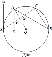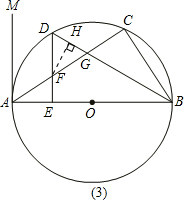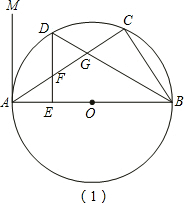分析:(1)根据直角三角形的性质可推出∠MAC+∠CAB=90°,然后切线的判定定理即可推出结论,(2)连接OD,由垂径定理可得OD⊥AC,再由∠EAF+∠AFE=90°,得cos∠AFE=sin∠EAF,然后通过推出∠EAF=∠EDO,可知cos∠AFE=sin∠EDO,求出sin∠EDO即可,(3)作FH⊥DG与H点,由△DFG的面积推出FH的长度,由D是弧AC的中点,可得∠CBD=∠DBA,再由DE⊥AB,推出∠EDB=∠DGF,可得△FDG为等腰三角形,由FH⊥DG,求出HG=DG=1.5,通过求证△HGF和△CGB相似,根据对应边成比例,即可推出BC的长度,便可求出结果.