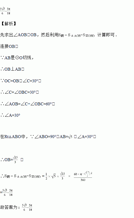 如图,AB是⊙O的切线,B为切点,AC经过点O,与⊙O分别相交于点D、C,若∠ACB=30°,AB=,则阴部分面积是_____.