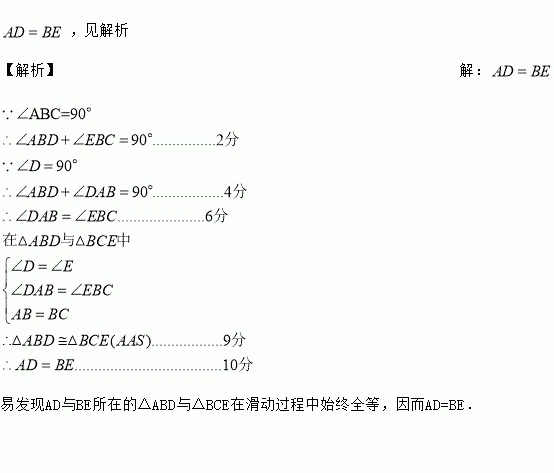 如图,把一个三角板(AB=BC,∠ABC=90°)放入一个“U”形槽中,使三角板的三个顶点A、C、B分别在槽的两壁及底边上滑动,已知∠D=∠E=90°,在滑动过程中,你发现线段AD与BE有什么大小关系?试说明你的结论.