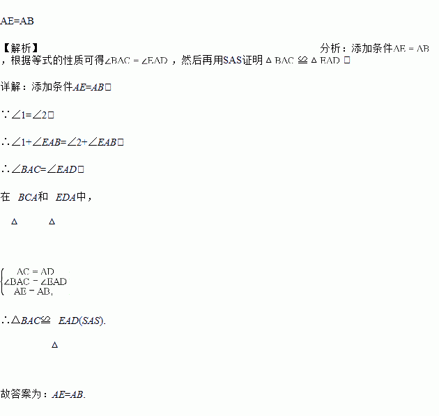 如图,已知∠1=∠2,AC=AD,请增加一个条件,使△ABC≌△AED,你添加的条件是______.