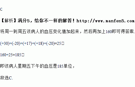 一个病人每天下午要测量一次血压,下表是该病人星期一至星期六血压变化情况(“+”表示比前一天上升的部分;“-”表示比前一天下降的部分),该病人上个星期日的血压为160单位,则该病人星期五下午的血压是( )