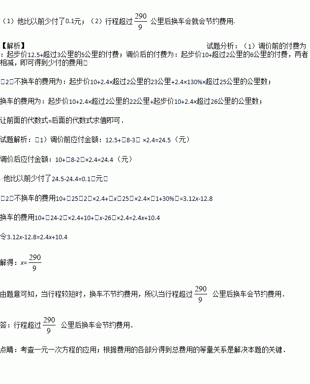 若设行程为x 公里(26<x<48 ),请用含x的式子分别表示出不换车的费用和换车的费用,并帮忙计算一下,行程超过多少公里后换车会就会节约费用(不考虑红灯等因素).