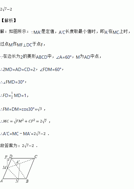 如图,在边长为4的菱形ABCD中,∠A=60°,M是AD边的中点,点N是AB边上一动点,将△AMN沿MN所在的直线翻折得到△A′MN,连接A′C,则线段A′C长度的最小值是______.