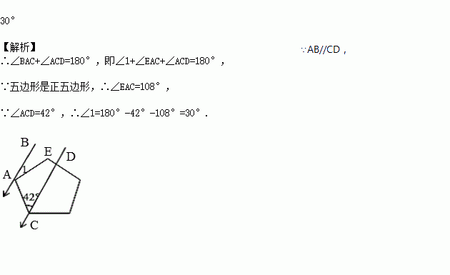如图,一束平行太阳光线照射到正五边形上,则∠1= ______.