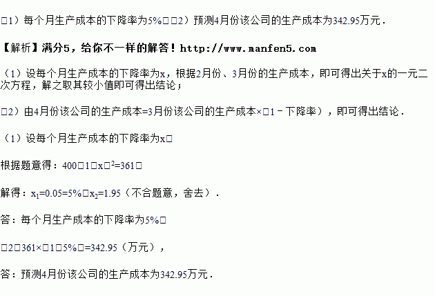 某公司今年1月份的生产成本是400万元,由于改进技术,生产成本逐月下降,3月份的生产成本是361万元.假设该公司2、3、4月每个月生产成本的下降率都相同.