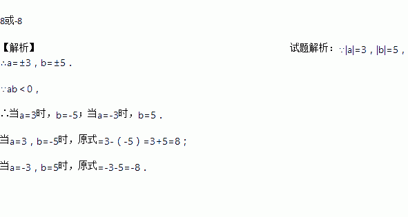 |a|=3,|b|=5,且ab<0,则a-b的值为___________.