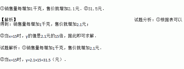 ¢ÙÏúÊÛÁ¿Ã¿Ôö¼Ó1ǧ¿Ë£¬ÊÛ¼Û¾ÍÔö¼Ó2.1Ôª£®¢Ú31.5Ôª£® ¡¾½âÎö¡¿ÊÔÌâ·ÖÎö£º¢Ù¸ù¾Ý±í¿ÉÒԵõ½£ºÏúÊÛÁ¿Ã¿Ôö¼Ó1ǧ¿Ë£¬ÊÛ¼Û¾ÍÔö¼Ó2.1Ôª£» ¢Úµ±x=15ʱ£¬yµÄÖµÊÇ2.1ÔªµÄ15±¶£¬¾Ý´Ë¼´¿ÉÇó½â£® ÊÔÌâ½âÎö£º¢ÙÏúÊÛÁ¿Ã¿Ôö¼Ó1ǧ¿Ë£¬ÊÛ¼Û¾ÍÔö¼Ó2.1Ôª£® ¢Úµ±x=15ʱ£¬y=2.1¡Á15=31.5£¨Ôª£©£®