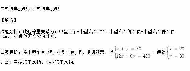 某停车场的收费标准如下:中型汽车的停车费为12元/辆,小型汽车的停车费为8元/辆,现在停车场共有50辆中、小型汽车,这些车共缴纳停车费480元,中、小型汽车各有多少辆?