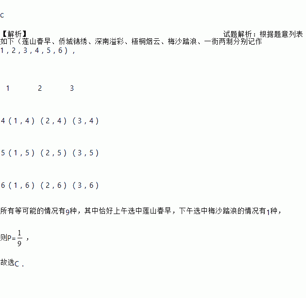 五一期间刚到深圳的小明在哥哥的陪伴下,打算上午从莲山春早、侨城锦绣、深南溢彩中随机选择一个景点,下午从梧桐烟云、梅沙踏浪、一街两制中随机选择一个景点,小明恰好上午选中莲山春早,下午选中梅沙踏浪的概率是( )