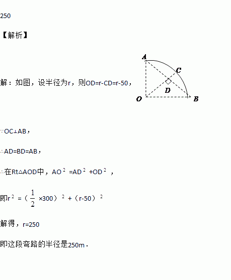 如图,一条公路的转弯处是一段圆弧(图中的),点O是这段弧的圆心,C是上一点,OC⊥AB,垂足为D,AB=300m,CD=50m,则这段弯路的半径是 m.