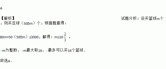 为有效开展“阳光体育”活动,某校计划购买篮球和足球共50个,购买资金不超过3000元.若每个篮球80元,每个足球50元,则篮球最多可购买( )