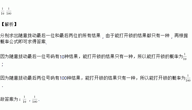密码锁的密码是一个四位数字的号码,每位上的数字都可以是0到9中的任一个,某人忘了密码的最后一位号码,此人开锁时,随意拔动最后一位号码正好能把锁打开的概率是______.若此人忘了中间两位号码,随意拔动中间两位号码正好能把锁打开的概率是______.