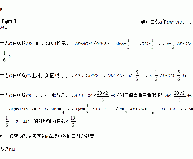 ,动点P自A点出发,沿着边AB向点B匀速运动,同时动点Q自点A出发,沿着边AD﹣DC﹣CB匀速运动,速度均为每秒1个单位,当其中一个动点到达终点时,它们同时停止运动,设点P运动t(秒)时,△APQ的面积为s,则s关于t的函数图象是( )