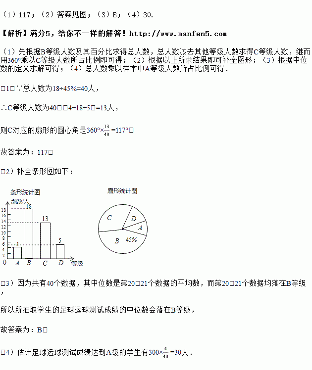 (4)该校九年级有300名学生,请估计足球运球测试成绩达到A级的学生有多少人?