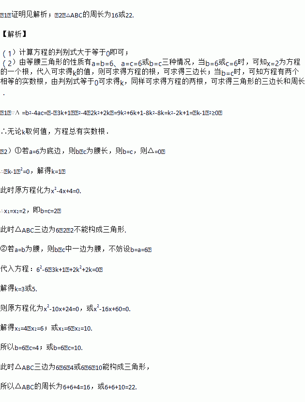 (2)若等腰△ABC的一边长a=6,另两边长b、c恰好是这个方程的两个根,求此三角形的周长.