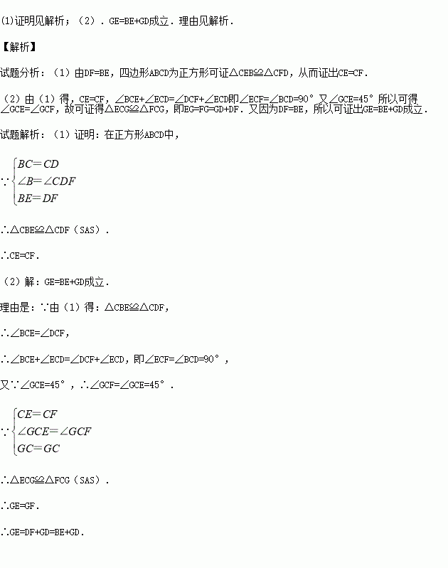 (2)若点G在AD上,且∠GCE=45°,则GE=BE+GD成立吗?为什么?