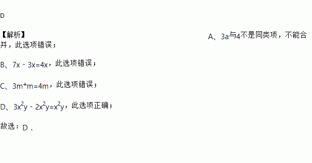 C. 3m+m=3m2 D. 3x2y﹣2x2y=x2y