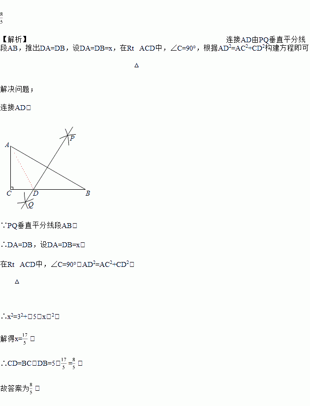如图,在Rt△ABC中,∠C=90°,AC=3,BC=5,分别以点A、B为圆心,大于AB的长为半径画弧,两弧交点分别为点P、Q,过P、Q两点作直线交BC于点D,则CD的长是_____.