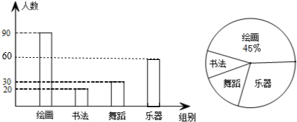 13.为了解学生课余活动情况,某校对参加绘画、书法、舞蹈、乐器这四个课外兴趣小组的人员分布情况进行抽样调查,并根据收集的数据绘制了下面两幅不完整的统计图,请根据图中提供的信息,解答下面的问题:(1)此次共调查了多少名同学?