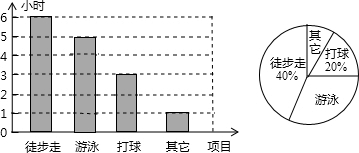 (2)小明每周打球时间为=15×20%=3小时,游泳时间=15-6-3-1=5小时