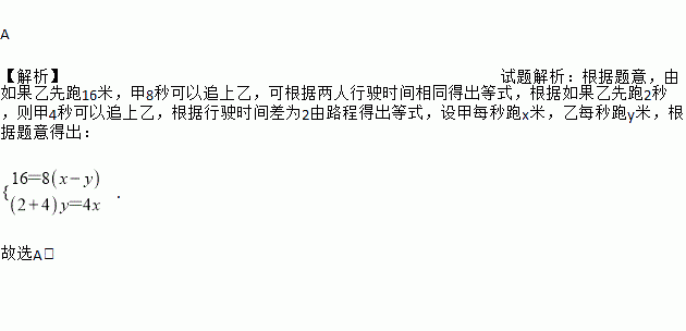 两人练习跑步,如果乙先跑16米,甲8秒可追上乙,如果乙先跑2秒钟,则甲4秒可追上乙,求甲乙二人每秒各跑多少米?若设甲每秒跑x米,乙每秒跑y米,则所列方程组应该是( )。