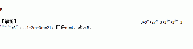 B 【解析】3•9m•27m=3•32m•33m=31+2m+3m=321,∴ 1+2m+3m=21,解得m=4.故选B.