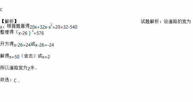 如图,在宽为20米、长为32米的矩形地面上修筑同样宽的道路(图中阴影部分),余下部分种植草坪.要使草坪的面积为540平方米,则道路的宽为( )
