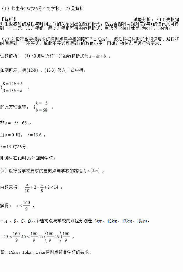 如果师生骑自行车上午8时出发,到植树地点后,植树需2小时,要求14时前返回到学校,往返平均速度分别为每时10km、8km,现有A、B、C、D四个植树点与学校的路程分别是13km、15km、17km、19km,试通过计算说明哪几个植树点符合要求.
