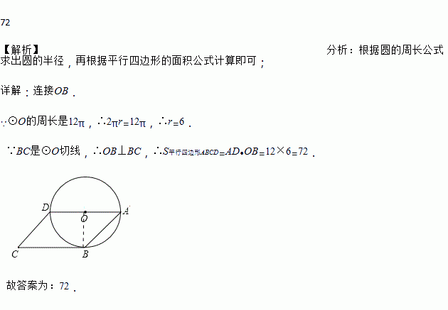 如图,四边形ABCD是平行四边形,其中边AD是⊙O的直径,BC与⊙O相切于点B,若⊙O的周长是12π,则四边形ABCD的面积为_________.