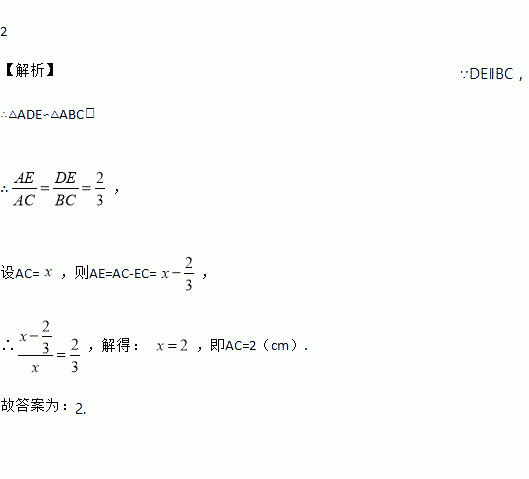 如图, DE与△ ABC的边 AB, AC分别相交于 D, E两点,且 DE∥ BC.若 DE=2cm, BC=3cm, EC=cm,则 AC=________cm.